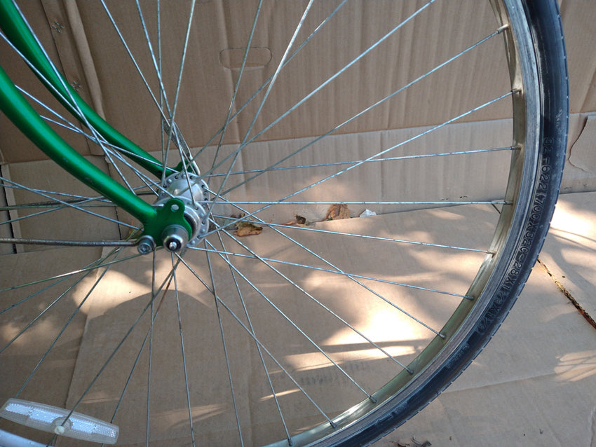 1970s Apollo mixte frame road bike hybrid conversion with lovely sept back bars on a sultry green paint job. Modern 700C alloy wheels with alloy cranks and stem keep this sweety light, and responsive. 2x6 index shifting. 17" frame suits rider 5'2 - 5'7". Completely rebuilt and reconditioned. USED. One year warranty
