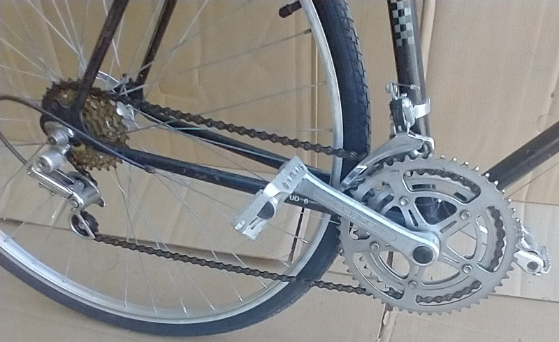 1970s classic Peugeot U06 road frame converted to a hybrid city bike with hybrid style flat bars. Nice and light with alloy cranks, Quick release alloy wheels and zippy 2x6 drivetrain. Chubby 27 x 1 3/8 tires. fully recondition. USED. One year labour warranty. 56cm seat tube, 57 top tube. Suits rider 5'9 - 6'.